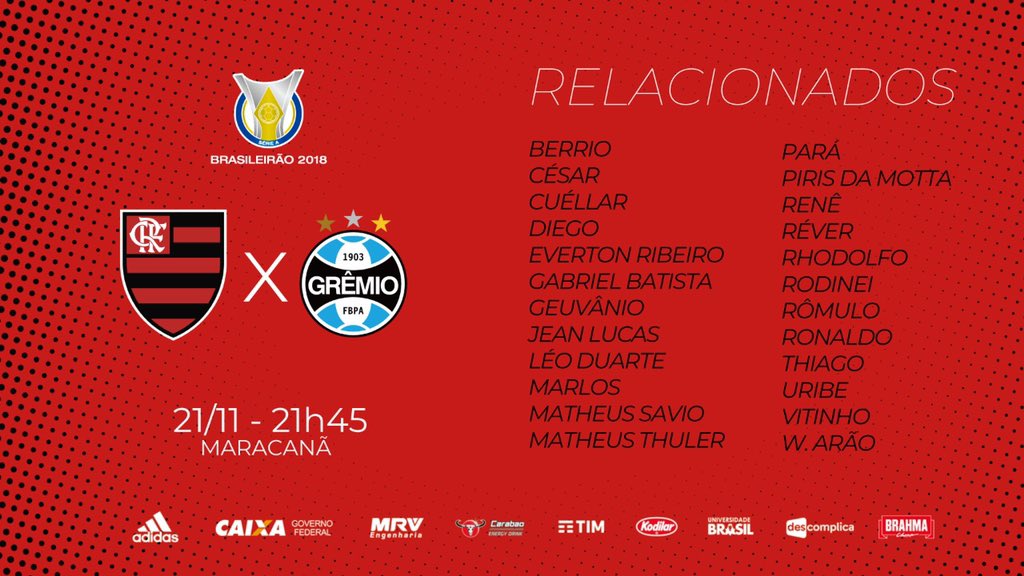 Flamengo w środę zmierzy się z Grêmio na stadionie Maracanã w ramach 36. kolejki Campeonato Brasileiro. Po wtorkowym treningu w centrum sportowym Ninho do Urubu, Rubro-Negro opublikowali listę piłkarzy powołanych na to spotkanie.