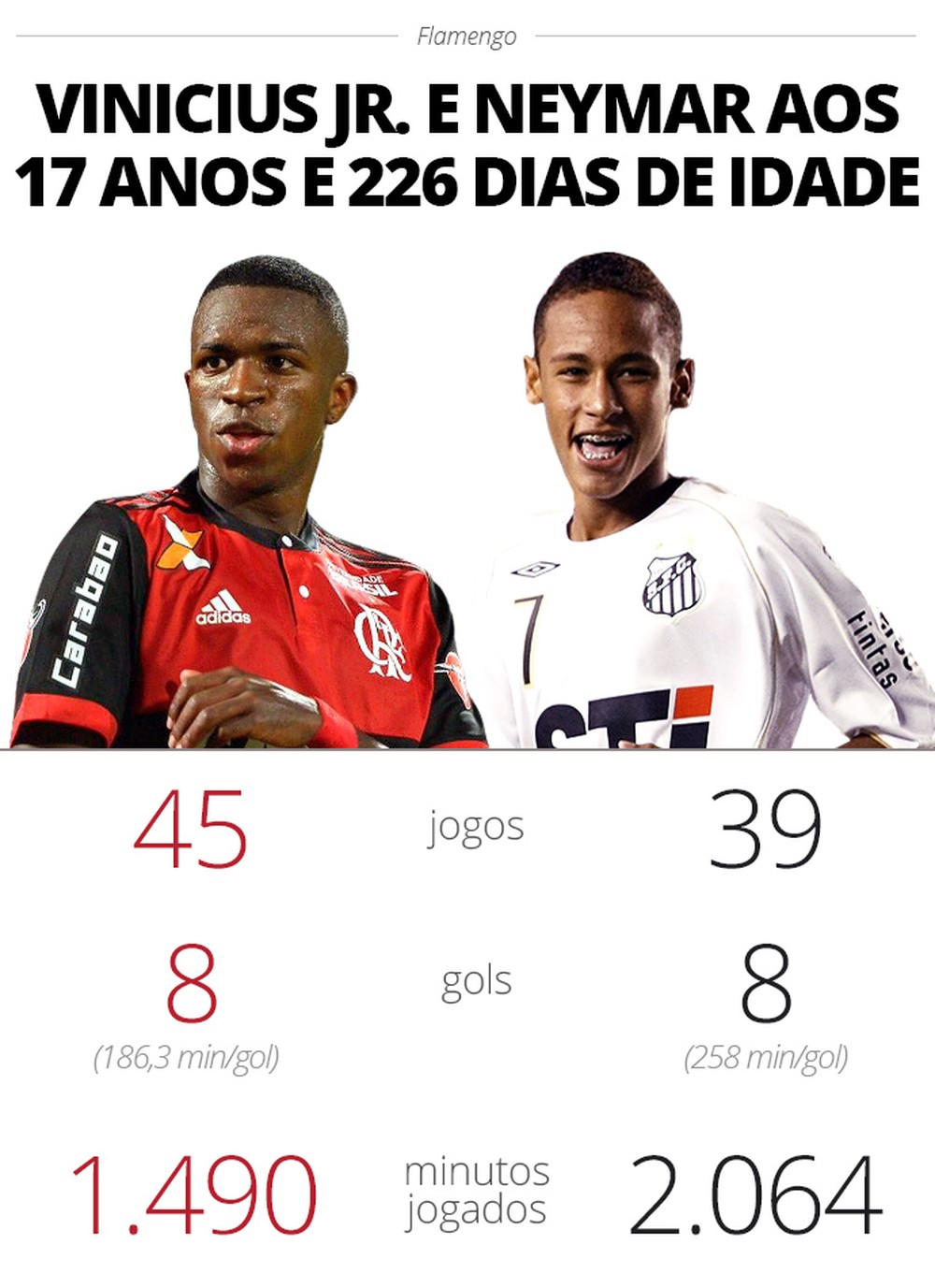 Z niecałym rokiem w profesjonalnej piłce (zadebiutował 13 maja 2017 roku), Vinícius Júnior zostanie wystawiony na próbę w największym konkursie na kontynencie na długo przed Neymarem. Jeśli młody zawodnik wystąpi w środowej grze przeciwko River, to zadebiutuje w Copa Libertadores mając ledwie 17 lat, podczas, gdy były zawodnik Peixe debiutował w tych rozgrywkach mając 19 lat w 2011 roku, gdy Santos zdobył mistrzostwo.
