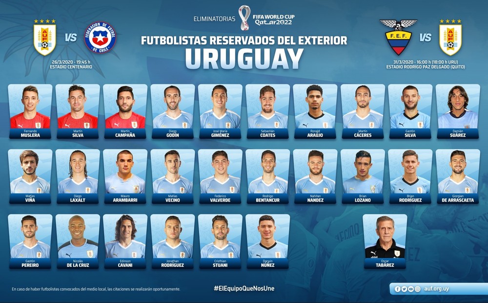 Początek zgrupowania zaplanowany jest na dzień 23 marca w Montevideo. Los Charrúas w dniu 26 marca zmierzą się z Chile na stadionie Centenário w Montevideo, a następnie na wyjeździe z Ekwadorem w dniu 31 marca.