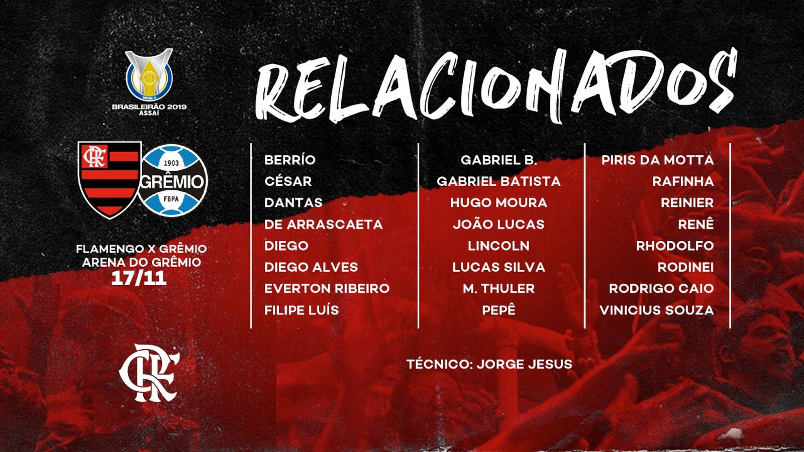 Flamengo ogłosiło w sobotę listę piłkarzy powołanych na niedzielny mecz przeciwko Grêmio w Porto Alegre w ramach 33. kolejki Campeonato Brasileiro. Obrońca Pablo Marí i napastnik Vitinho nie są do dyspozycji trenera Jorge Jesusa. Obaj poczuli ból mięśni i pozostaną w Rio de Janeiro, wykonując pracę fizyczną w centrum sportowym Ninho do Urubu.