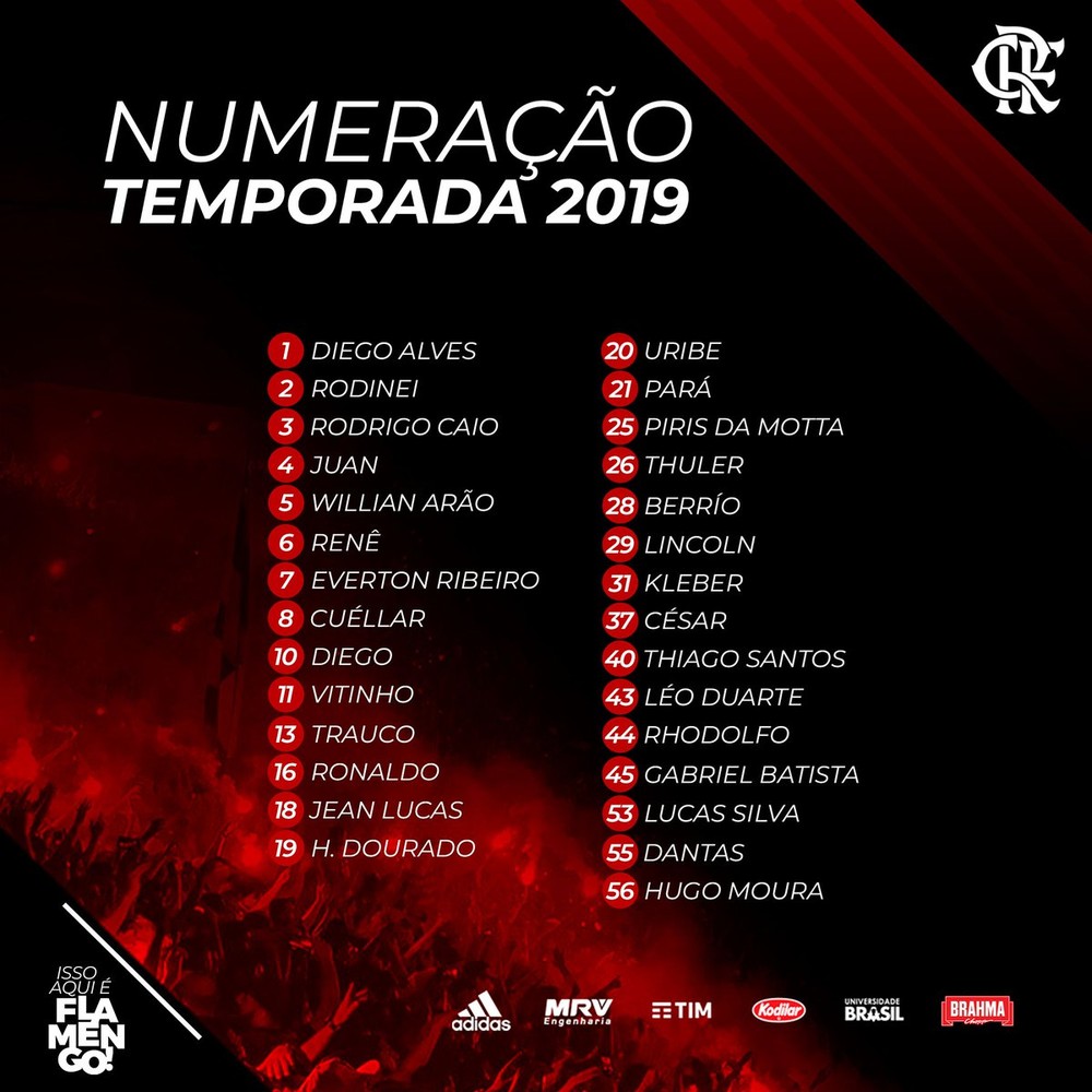 Dotychczasowe jedyne wzmocnienie Mengão, obrońca Rodrigo Caio będzie występować z numerem 3, który nie miał żadnego właściciela od zeszłego roku. Swój numer na koszulce zmienił Vitinho, który przejął 11 od Lucasa Paquety, który odszedł do Milanu. Diego, który ma kontrakt tylko do końca lipca i jego przyszłość jest niepewna pozostał z "dziesiątką" na plecach. Włączenie do pierwszego składu, czterech wychowankowie volante Hugo Moura, środkowy obrońca Dantas, prawy obrońca Klebinho i napastnik Lucas Silva wybrali odpowiednio 56, 55, 31 i 53.